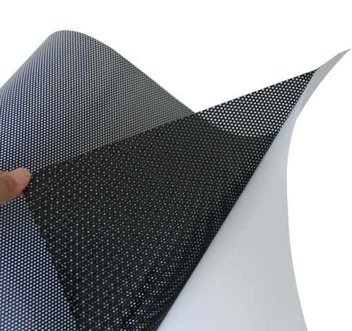 Black adhesive backing for 1-way window view for indoors and outdoors.